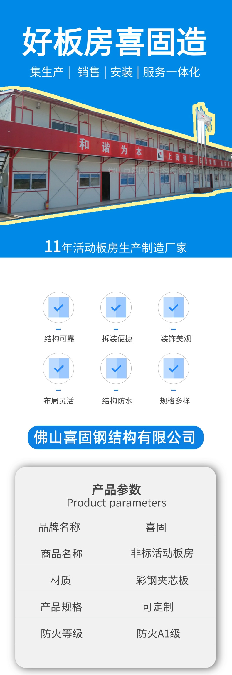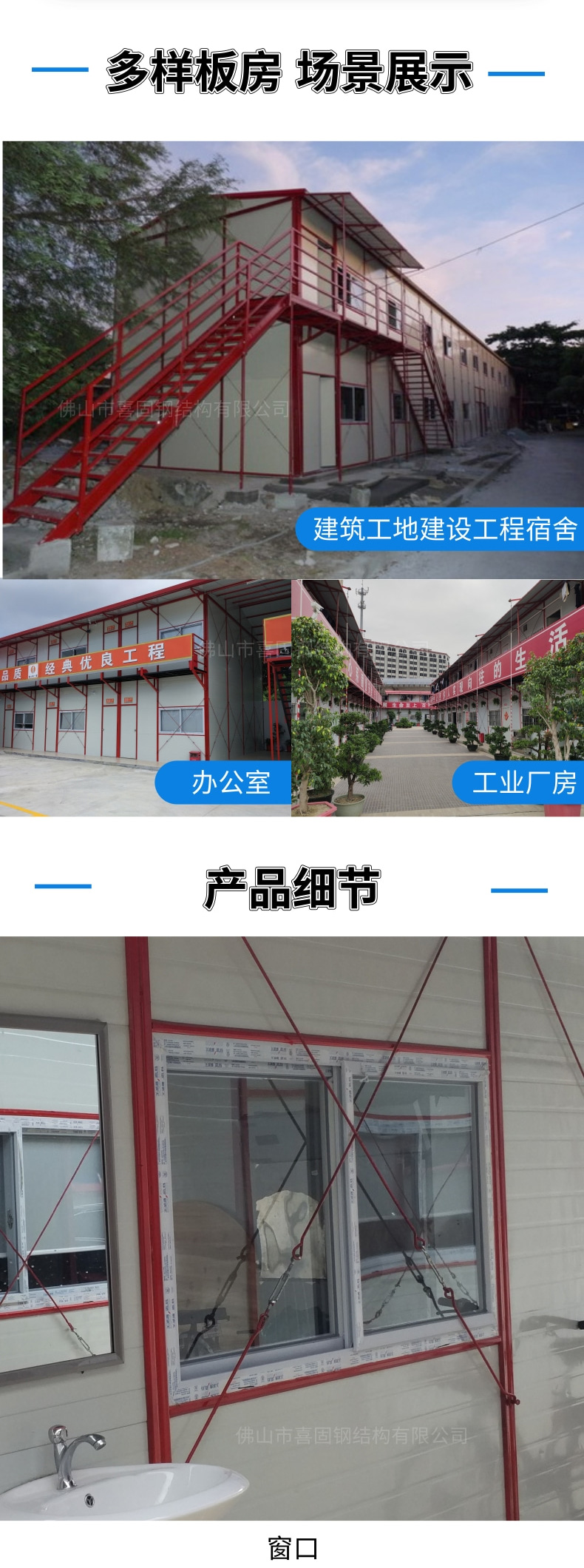 公司生產(chǎn)的“喜固”牌系列活動板房是在日式活動板房及國內(nèi)同類產(chǎn)品的基礎(chǔ)上經(jīng)過論證實踐后加改進(jìn)而成的,從而使“喜固”牌系列產(chǎn)品達(dá)到快速安裝、拆遷容易、美觀、安全、節(jié)約成本等特點。
